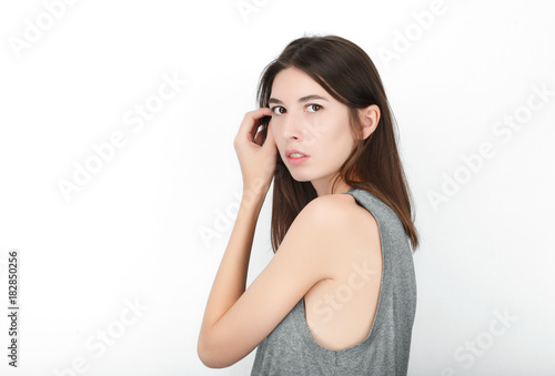 person, face, woman, white, isolated, background, girl, asian, portrait, female, young, model, caucasian, beautiful, sexy, adult, facial, looking, people, smile, studio, closeup, mixed, pretty, happy, attractive, beauty, care, concept, copy space, eye, fresh, head, make-up, natural, skin, skincare, space, expression, emotion, t-shirt, test