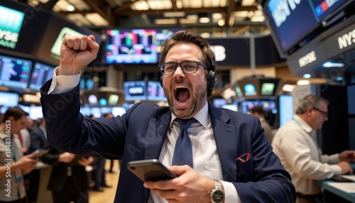 Excited trader celebrating a successful deal on the stock exchange floor.
