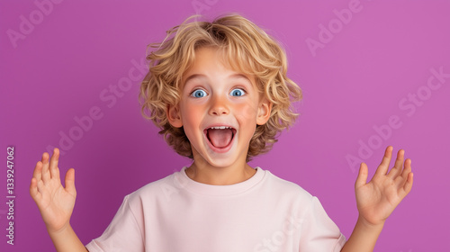 Excited young boy with curly blond hair, smiling wide against a bright purple background.