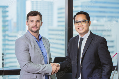 executive businessman hand shake finish dealing project business friend relationship mix race happy smiling