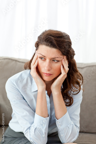 sitting, sofa, living room, attractive, brunette, cephalalgia, stressed, migraine, annoyance, temple, massaging, businesswoman, business, couch, caucasian, woman, female, pretty, beautiful, room, adult, 1, person, pain, ache, worried, problem, medicals, medicine, home, indoor, house, touching, face, head, ill, sick, disease, bad, bane, nuisance, trouble, exhausted