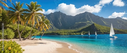 tropical, paradise, beach, ocean, palm, tree, sailboat, mountain, landscape, island, turquoise, water, sky, sand, coastline, shore, idylli, scenic, vacation, travel, nautical, vessel, maritime, destination, tour tourism, summer, caribbean, cloud, sunlight, tranquil, sunny, exoticism, get-away, journey, holiday, relaxation, adventure, wanderlust, explore, serenity, calmness, seascape