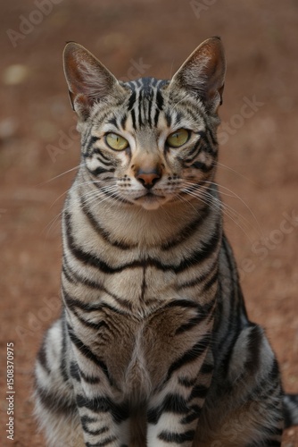 Exotic wild cat rests on the ground, displaying striking stripes and an intense gaze in a natural setting