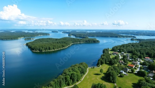 Expansive aerial view showcases a serene lake dotted with islands, fringed by lush green forests.
