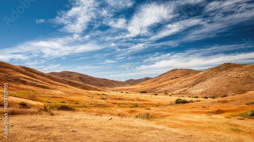 Expansive Desert Landscape Under Clear Blue Sky with Wispy Clouds and Golden Grass in the Valleys of Rolling Hills