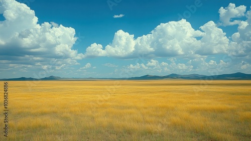 Expansive golden grassland under a blue sky.