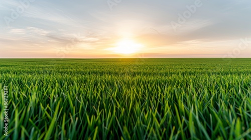 Expansive green grass field with a stunning sunset, warm colors blending into the horizon tranquil scenery