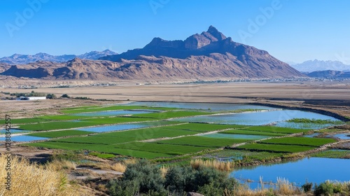 Expansive irrigation network supporting potato plants, transforming dry desert land into productive agricultural fields in the Middle East.