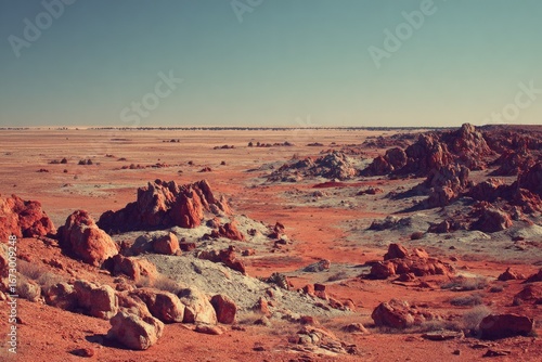 Expansive red desert landscape with unique rock formations under a clear sky