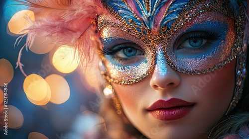 Experience masked elegance with this Venetian-inspired opulence featuring feathers and beads against a lively Mardi Gras backdrop.