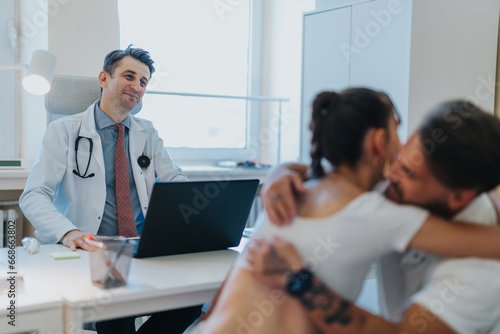 Experienced doctor informs young lady and her husband about the pregnancy. Positive pregnancy test.