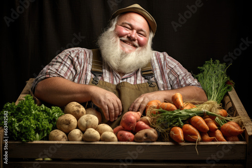 Experienced farmer leaning against a wooden crate of vegetable fresh produce on dark background