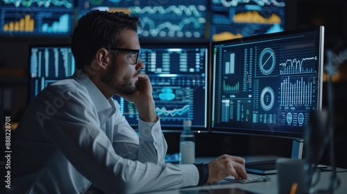 Expert financial analyst deciphering big data on desktop lcd screen for investment success