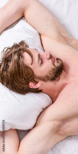 Expert tips on sleeping better. Bearded man sleeping face relaxing on pillow. How much sleep you actually need. Man handsome guy lay in bed. Get adequate and consistent amount of sleep every night