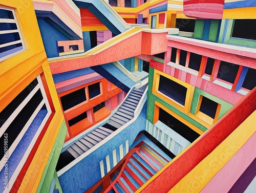 vibrant, architectural, design, colourful, staircase, depiction, modern, geometry, structure, creativity, art, perspective, shape, space, urban, illustration, interior, aesthetic, layout, pattern, visualisation, brightness, contrast, line, angle, harmony, composition, high-coloured, palette, flow, movement, ambience, depth, inspiration, transformation, environment, dynamic, perception, balance, functionality, orientation, innovative, construction, imagery, scenery, craftsmanship, unique, arrangement, realism