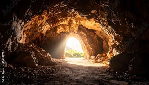 cave, entering, opening, rock, stone, sunlight, streaming, natural, formation, stalactite, dark, light, contrast, adventure, exploration, travel, tour tourism, landscape, geology, nature, terrain, path, pathway, leading, through, daylight, scene, underground, formation, entrance, bright, texture, background, ground