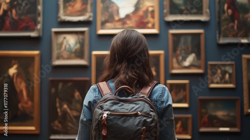 art gallery, visitor, artwork, museum, contemplation, culture, creativity, history, backpack, collection, exhibition, emotion, inspiration, aesthetic, beauty, scene, craftsmanship, heritage, decor, appreciation, picturesque, exploration, painting, artist, narrative, avocation