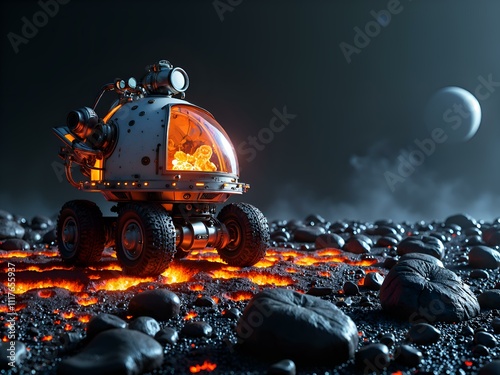 alien, rover, terrain, digital, art, landscape, wheel, universe, imagination, planet, star, high-coloured, cosmos, exploration, discovery, moon, innovation, vehicle, glow, fantasy, futuristic, light, science, mechanic, eclipse, daring, lava, rock, extraterrestrial, spacecraft, dome, technology, space, orange, distortion, adventure, environment, exploratory, vehicular