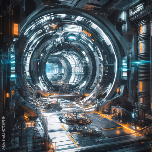 Exploring futuristic technology systems sci-fi laboratory digital art high-tech environment wide angle innovation concepts