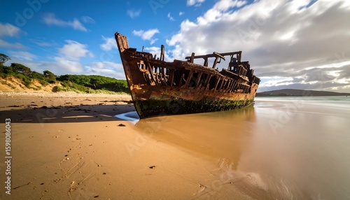shipwreck, rust-eaten, decaying, abandoned, sitting, beach, sandy, water, reflecting, long exposure, cloudy, sky, coastal, dramatic, moody, daytime, outdoors, seascape, maritime, travel, tour tourism, exploration, adventure, shore, sand, old, weathered, ocean, sea, coastline, landscape, foreground, horizontal, nature