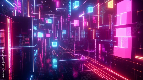 Exploring the neon grids of a cyber network visual content in a futuristic environment from an interactive perspective