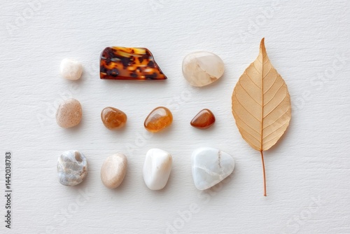 Exploring the Unique Beauty of a Tortoise Shell Fragment Alongside Natural Stones and a Dried Leaf