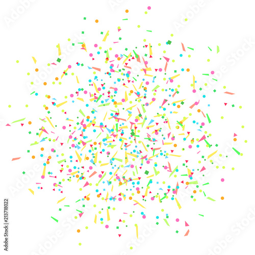 Explosion. Texture with colored elements on white. Geometric background with confetti. Pattern for design. Print for banners, posters, flyers and textiles. Greeting cards