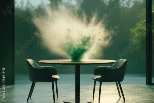 abstract, art, display, minimalist, interior, explosion, creative, furniture, design, modern, green, smoke, pattern, dramatic, concept, elegant, decor, style, contemporary, artistic, dynamic, high-coloured, indoor, expression, innovative, table, chair, spectacle, atmospheric, energetic, impact, visual, striking, flair, unique, bold, imagination, environmental, setting, surreal, peaceful, harmony