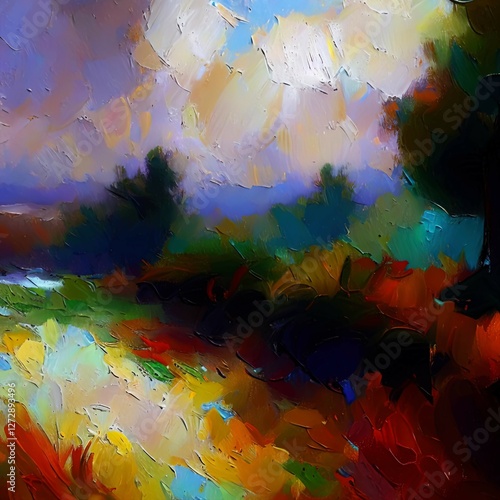 expressionism, vivid colors, abstract landscape, blue water, warm tones, scenic beauty, scenic view