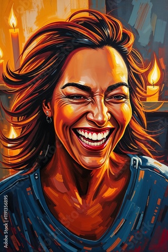 Expressive painting of a laughing woman in warm candlelit setting. mother,