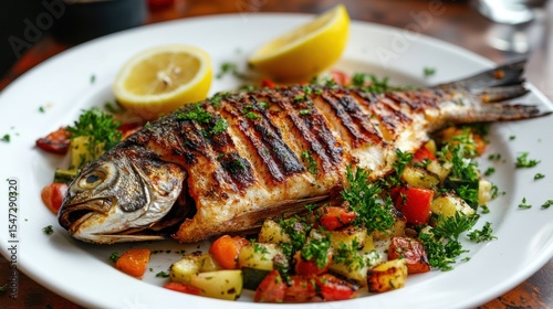 Exquisite grilled whole fish served with colorful vegetables and lemon garnish