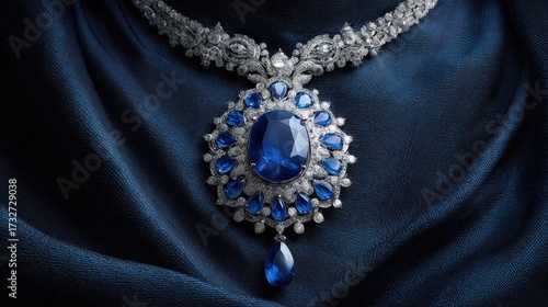 jewellery, necklace, blue, sapphire, gem, gemstone, luxury, elegance, diamond, crystal, accessory, precious, sparkle, shiny, brilliant, closeup, detail, fashion, stylish, expensive, radiant, dripped, pendant, adornment, shimmering, decor, decoration, glamour, glamourous, textile, fabric, silk, satin, fold, background, elegant, refined, ornate, design, craft, art, crafted, treasure, wear, sophisticated, beautiful