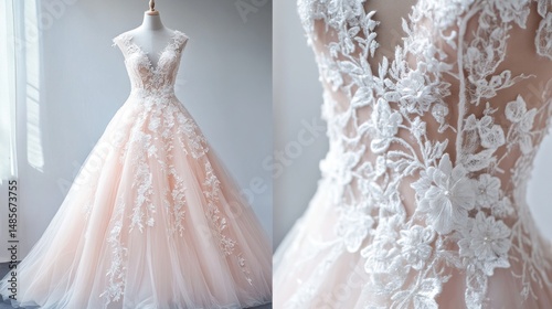 dress, gown, wedding, bridal, lace, floral, reddening, peach, pink, bridal gown, apparel, fashion, elegant, romantic, feminine, beauty, style, attire, garment, clothing, sewing, embroidered, tulle, formal, event, celebration, occasion, sophisticated, dainty, intricate, delicate, lovely, charming, gorgeous, pretty, fairy tale
