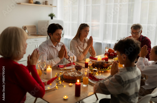 Extended family praying before Christmas holiday dinner, giving thanks to God at table indoors. Millennial spouses with kids and senior parents celebrating Xmas with festive meal and prayer