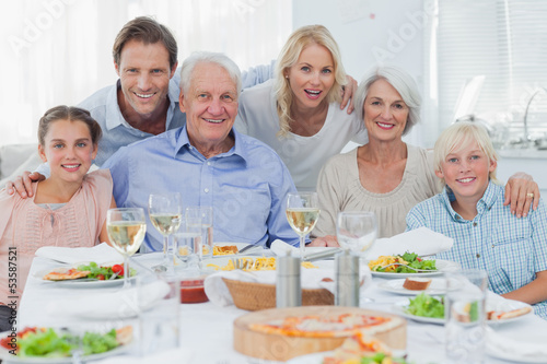 30s, woman, female, caucasian, children, boy, male, 40s, mature adult, man, 70s, girl, indoor, fair hair, blond, light hair, short hair, long hair, happy, smiling, father, mother, son, daughter, home, house, household, dining room, table, meal, dinner, together, smile, cheerful, salad, pizza, grandmother, grandfather, grandson, granddaughter, grandmother, grandfather, posing, sitting, standing