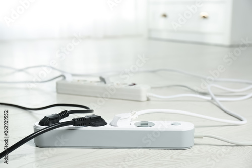 Extension cords on floor indoors, space for text. Electrician's professional equipment