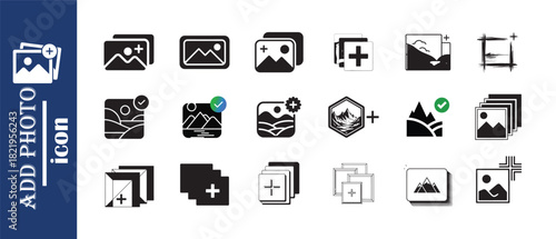 Extensive add photo icon set featuring various styles for image uploads and gallery management