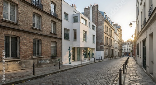 Exterior of a contemporary house located in a historic Parisian street, featuring charming brickwork with modern abstract sculptures. Premium Home Exterior Inspiration