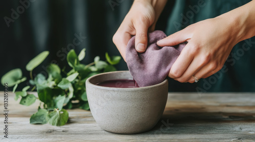 natural, dye, plant, organic, colours, extraction, hand, fabric, bowl, leaf, environmentally friendly, sustainable, process, textile, craft, artistry, creativity, nature, environment, green, pigment, traditional, homemade, bricolage, workshop, rustic, hand-made, earth, method, botanical, greenery, mixture, artisanal, clothes, purple, liquid, solution, wooden, table, ceramic, eco, dyeing, living, conscious