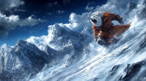 Extreme snow sport athlete soaring through the alpine air against a backdrop of towering peaks and snowcapped mountains on a sunny day