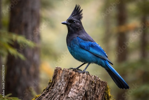 Exuberant Steller's Jay perched confidently on a bark-covered stump featuring colorful plumage and a muted natural background