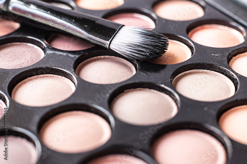 eye shadow is close. A makeup brush with eye shadow on it scatters the grains. macro palettes with shadows