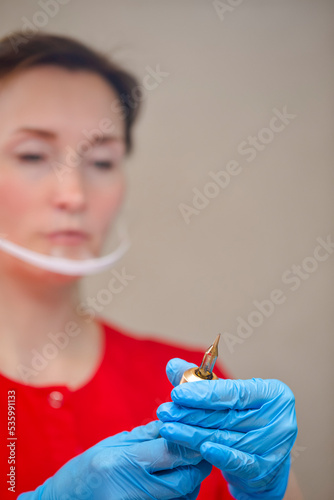 Eyebrows microblading concept. Cosmetologist preparing for eyebrow permanent makeup procedure While Beautician is wearing face protective masks due to Covid-19 pandemic.