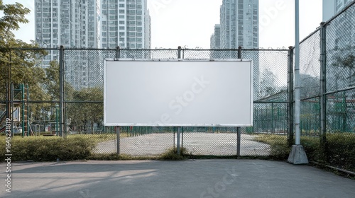 large, blank, white, poster, space, hanging, metal, fence, play, ground, billboard, signs, advertisement, advertising, sky, board, marketing, empty, banner, commercial, road, city, message, advertise, business, street, advertisement, urban, bill, promotion, eye-catching, photo