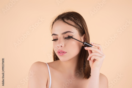 Eyelashes makeup. Beauty model shaping eyelashes with brow pencil closeup. Womans eyelashes with lashes brush. Natural make up. Modeling eyelashes. Comb lashes.