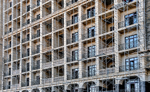 Facade of a multi-story building under construction with scaffolding and balconies.
