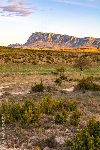Face nord du Pic Saint-Loup, illuminée par le soleil couchant, dans un paysage quasi désertique de garrigue (Occitanie, France)