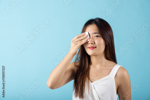 Facial Beauty Treatment Hygiene skin. Asian beautiful young woman removing cosmetic make up using pad cotton face cleaner disc, studio shot isolated on blue background, Happy female cleaning eyes