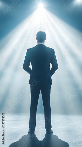 spotlight, silhouette, confidence, elegant, anticipation, destiny, aspiration, promise, business, success, career, determination, goal, leader, achievement, empowered, motivated, professional, suit, leadership, vision, strategic, future, planning, ambition, upward, growth, hope, sharpened, inspiration, bright, light, stage, shadow, power, backview, person, man, direction, journey, standing, forward, breakthrough, path, progress, strength