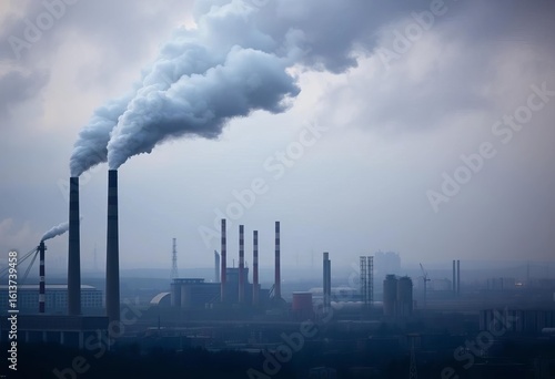Factory smokestacks belching dark smoke into a smog-filled cityscape, dark smoke, airborne pollutants